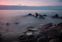Roze meerlandschap met rotsblokken op het Baikalmeer in Rusland