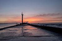 Spiegelende avondlucht (oranje / roze) op de natte pier van Hoek van Holland