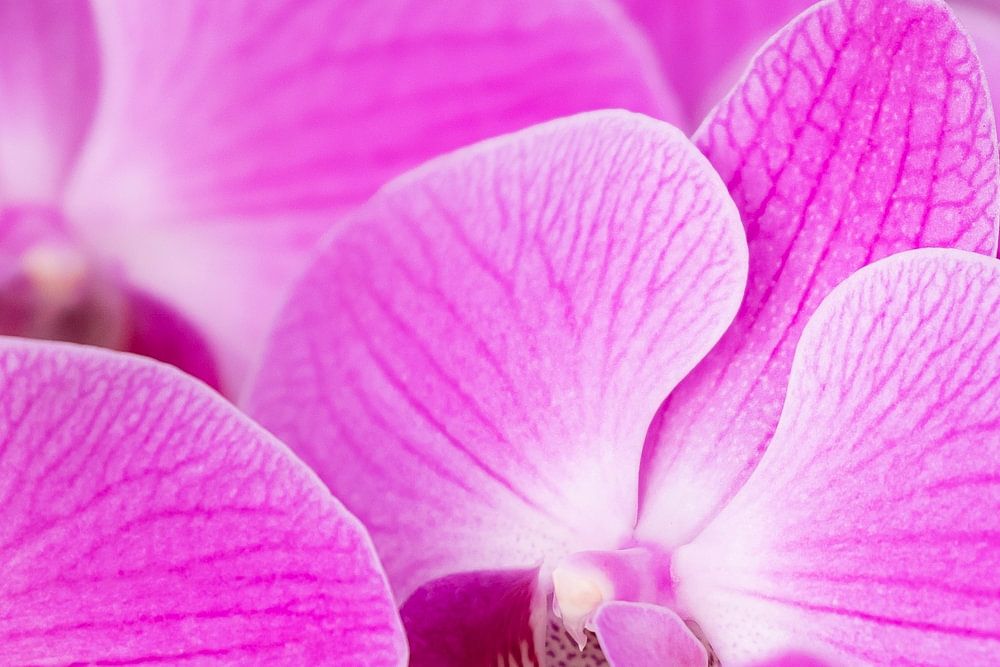 De orchidee geeft ontzettend mooie bloemen die in diverse kleuren te vinden zijn. Op deze foto zijn de roze bloemen van verschillende takken in beeld gebracht. En de kleur spat eraf! Door de combinatie met het wit en de zichtbare bladaderen is het zeker geen saai beeld.
