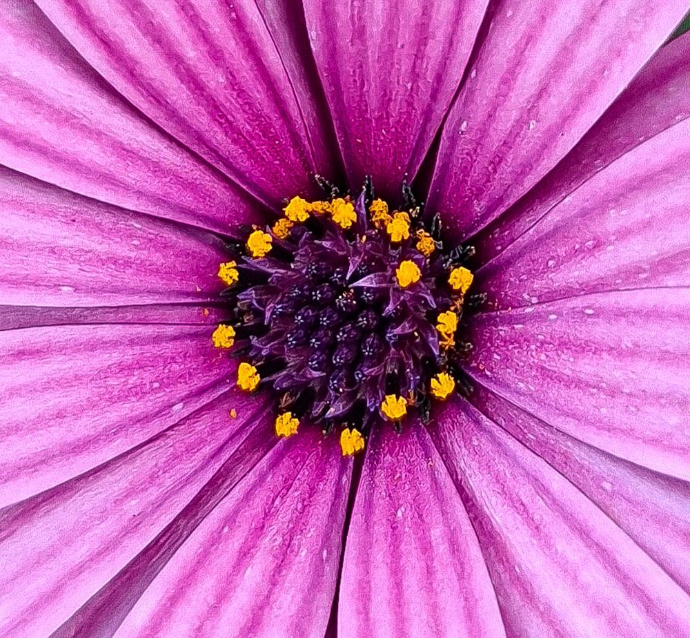 Een close-up van een levendige, paarsroze bloem in volle bloei, symmetrisch opgebouwd met lange, smalle bloemblaadjes die straalsgewijs uit het centrum ontspringen. Elk bloemblad heeft subtiele ribbels die de textuur benadrukken en een gevoel van diepte creëren. In het hart van de bloem bevindt zich een donkerpaarse kern met een cirkel van felgele stuifmeelkorrels, die als kleine stipjes het centrum sieren en een krachtig contrast vormen met de paarstinten. De achtergrond is onscherp en groen, wat de bloem nog sterker naar voren laat komen. Deze afbeelding straalt frisheid en natuurlijke perfectie uit.