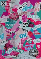 Koop dit abstracte kunstwerk Roze, paarse en turquoise collage gemaakt van snippers oud papier van Trinet Uzun op canvas, aluminium dibond, (ingelijste) fotoprint, behang en ArtFrame, op maat geprint in Fine-Art kwaliteit.