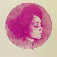 De afbeelding toont een pentekening van een vrouwelijk profiel, gevat binnen een cirkel met een roze achtergrond. De tekening is uitgevoerd in een monochrome roze tint, waardoor een dynamisch contrast ontstaat met de lichte achtergrond. De lijnen zijn fijn en gedetailleerd, met variërende intensiteit die diepte en textuur geeft aan het…