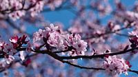 Een foto van een tak met roze pruimenbloesem.