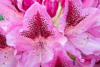 Close up van een roze bloem van een rododendron met meeldraden en stampers.