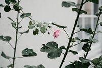 Dit beeld maakt me vrolijk ten eerste door het kleur gebruikt. Zacht pastel tinten, een vintage of romantische vibe. Maar ook het idee dat deze roze struik zijn best doet en het gelukt is om 1 lief klein roze roosje te laten bloeien.