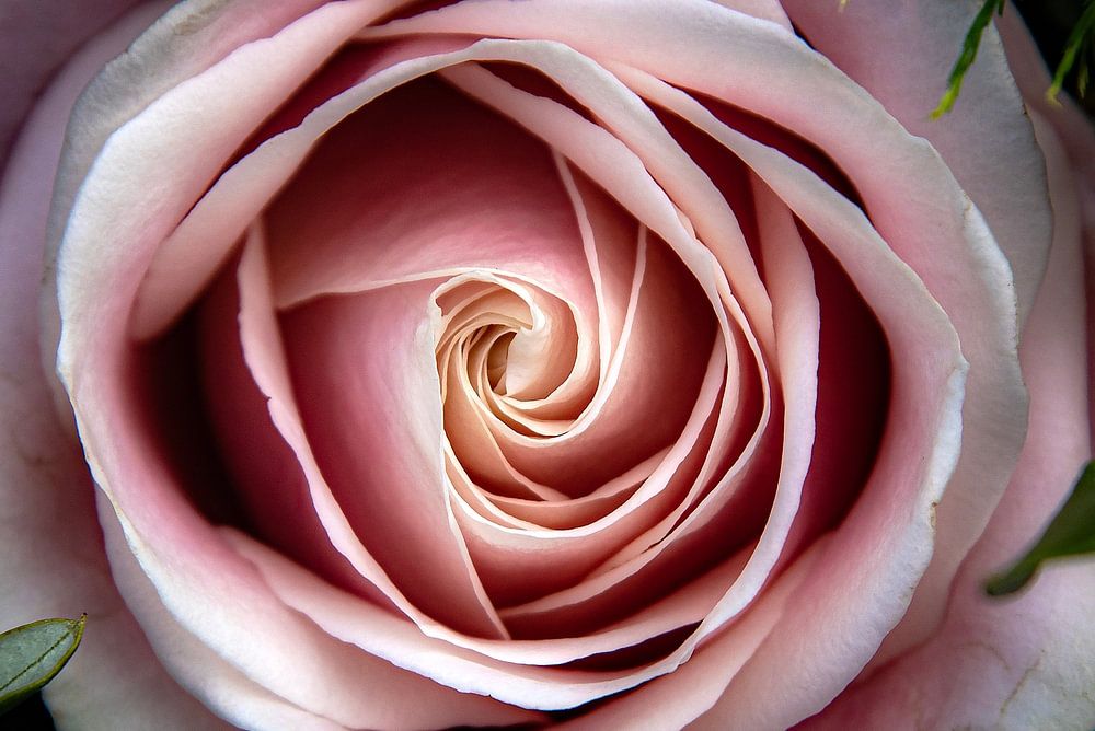 Opname van en roos met roos- en witgetinte rozenblaadjes. Opname is gemaakt van bovenuit zodat de opbouw van de roos zeer goed te zien is. Macro-opname
