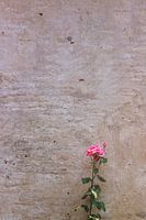 Slechts een roze roos voor een gestucte bruine stenen muur.