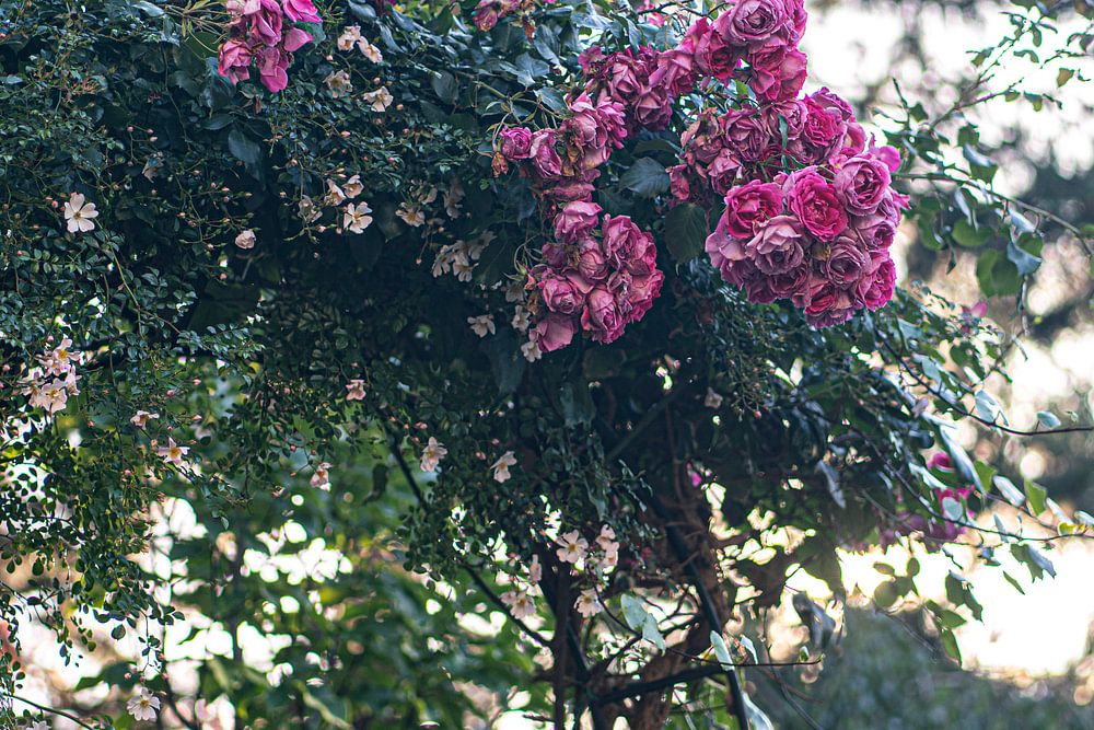 In hartje Utrecht in Nederland staat een uniek tuin vol met zomerse bloemen. Dit avond tafereeltje vol rozen straalt kleur en licht uit.