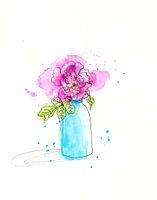 Een roze roos met groene bladeren staat in een blauwe vaas. Ik heb een losse zwarte inkttekening op een witte achtergrond ingekleurd met aquarelverf in roze voor de roos, groen voor de bladeren en blauw voor de vaas. Roze en blauwe…