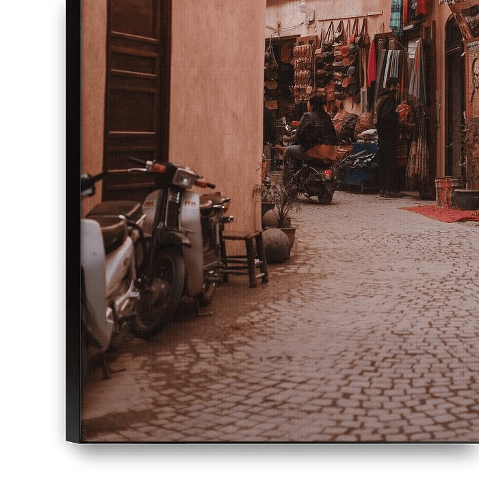 De medina met zijn kenmerkend roze gekleurde straten met souks, in het hart van Marrakech, Marokko. Op de foto zie je een typisch straatbeeld waarin je de sfeer van de stad kan proeven.