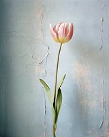 Roze tulp voor een afgebladderde lichtblauwe muur in wabi-sabi stijl. In de traditionele Japanse esthetiek is wabi-sabi een wereldbeeld waarin de acceptatie van vergankelijkheid en imperfectie centraal staat. De esthetiek wordt soms beschreven als een waardering voor schoonheid die "onvolmaakt, vergankelijk en onvolledig" van aard is. Het komt veel voor in vele vormen van Japanse kunst. Past ook in de woonstijl Japandi
