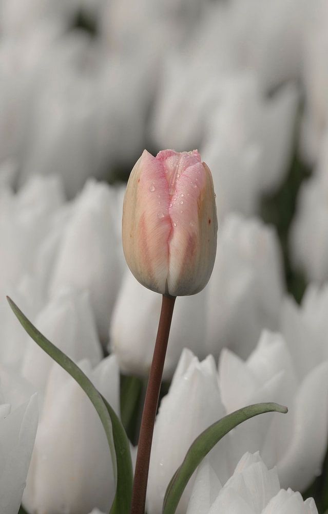 Een mooie roze tulp, nog nat van de regen, verdwaald in het witte tulpenveld. Eenzaam, maar niet alleen, steekt hij boven alle tulpen uit en trekt zo de aandacht. Het veld met tulpen ligt op het eiland Goeree-Overflakkee in de provincie Zuid-Holland in Nederland.