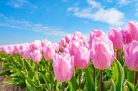Roze tulpen groeien in een veld tijdens een mooie lentedag in de Noordoostpolder in Flevoland, Nederland. Laag bovenaanzicht met een blauwe lucht boven het tulpenveld.