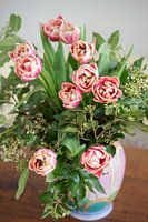 Roze tulpen in vaas. Bloemen krijgen staat voor vriendschap, geluk, vrolijkheid of zelfs liefde. Waarom zou je zo'n mooi boeket niet vereeuwigen en aan je muur hangen?