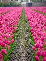 Een rij met roze tulpen. in April zie je de mooiste tulpen in noordholland. Als je met de fiets of met de auto in de maand April langs de velden kunt rijden is dat de maand om het te doen.