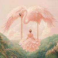 "Roze Vederlichte Droomschommel" is een poëtische en dromerige titel die perfect past bij de betoverende scène die de afbeelding oproept. Het beeld laat een surrealistische fantasiewereld zien waarin een vrouw, gekleed in een elegante jurk van roze veren, vredig op een schommel zit. De schommel wordt gedragen door de majestueuze vleugels van een reusachtige flamingo, een symbool van elegantie, gratie en evenwicht.