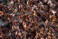 Roze zaaddozen van de Sedumbloem - Er is zoveel schoonheid in de natuur in elk stadium. Dit is een bloemhoofdje waarvan de zaaddozen meestal leeg zijn. De prachtige textuur en warme kleuren vielen me op. Ik moest het vastleggen. Binnenkort zal het nieuwe blad het oude vervangen.