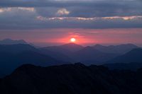 Roze zonsondergang gezien vanaf bergtop in de Alpen. Deze foto werd genomen van een bergtop bij de Achensee in Tirol. Dit is het karwendel gebergte achter de stad Innsbruck. Elke zonsondergang is anders in de alpen. In dit geval kreeg de zon een roze gloed. De bergen in de verte geven een mooi diepte perspectief.