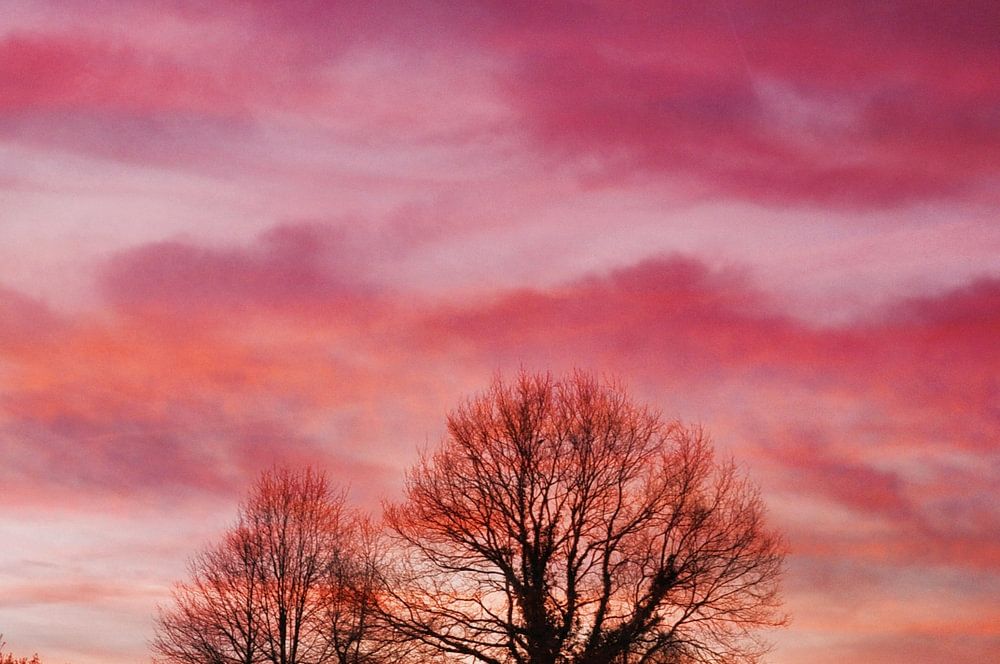 Een foto met een super lucht. Wolkjes worden roze gekleurd door de ondergaande zon. De kale bomen in het park verraden dat het winter is.