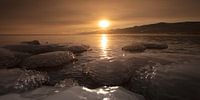 Roze zonsopgang over het ijs van het bevroren Baikalmeer, warm licht over de ijseilanden.