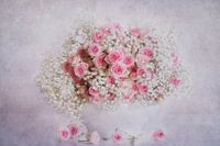 Een prachtig boeket van kleine roze rozen en witte gipskruid, pure romantiek. Een boeket vol liefde en schoonheid.