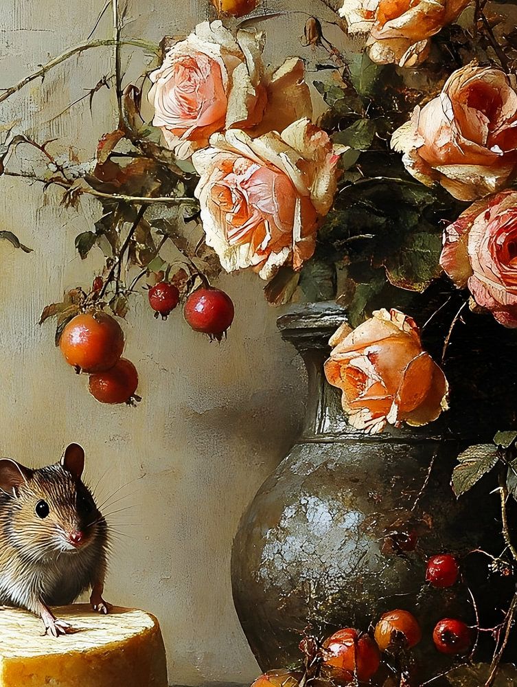 Een nostalgisch stilleven met een speelse twist: een muisje op een blok kaas midden tussen verwelkte rozen en herfstige bessen, alles in de sfeer van een barok schilderij. Dit kunstwerk combineert klassieke elegantie met charmante humor.