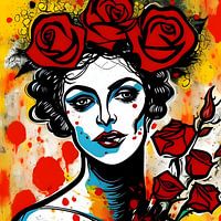 In dit kunstwerk komt een dromerig vrouwenportret tot leven, verrijkt met symbolische rode rozen die elegant uit haar hoofd en handen ontspruiten. De vrouw kijkt met een bedachtzame blik rechtstreeks naar de toeschouwer, haar expressie doordrongen van mysterie en introspectie. Een gele achtergrond, doordrenkt met nuances van beige, omlijst het tafereel en draagt bij aan de warme, speelse sfeer.