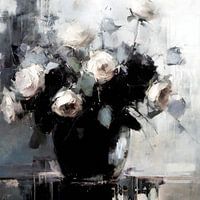 Een vaas met een boeket rozen in voornamelijk zwart, wit en grijs tinten.