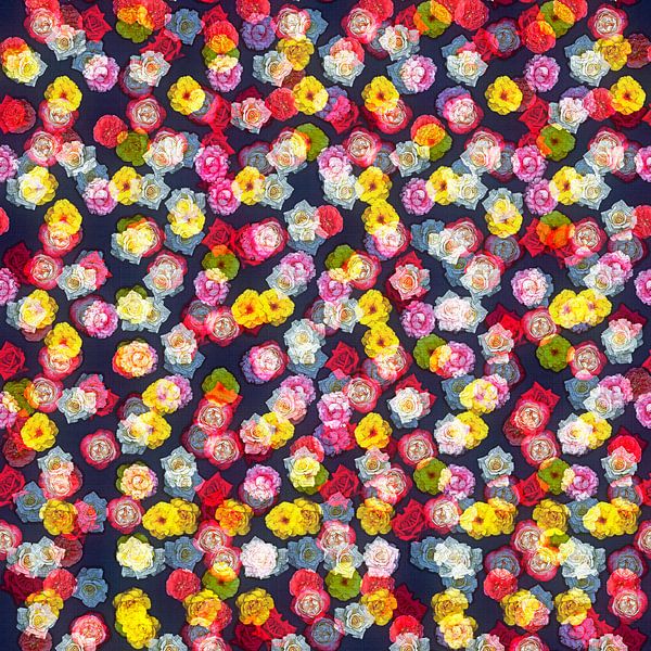 Foto uit de serie Rozenblaadjes: Patroon van vele kleurrijke rozenblaadjes verspreid op een donkerblauwe achtergrond