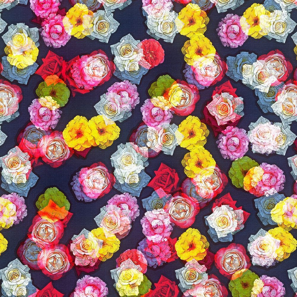 Foto uit de serie Rozenblaadjes: Patroon van vele kleurrijke rozenblaadjes verspreid op een donkerblauwe achtergrond