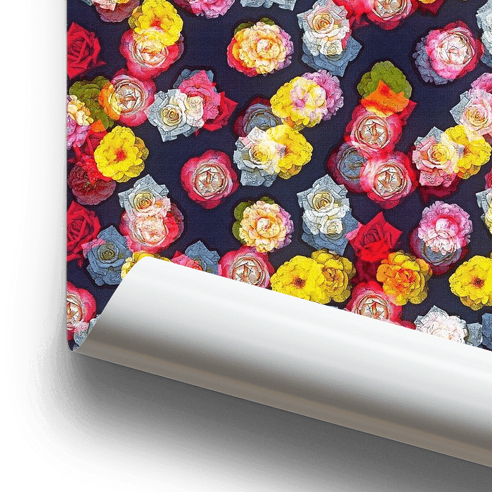 Foto uit de serie Rozenblaadjes: Patroon van vele kleurrijke rozenblaadjes verspreid op een donkerblauwe achtergrond