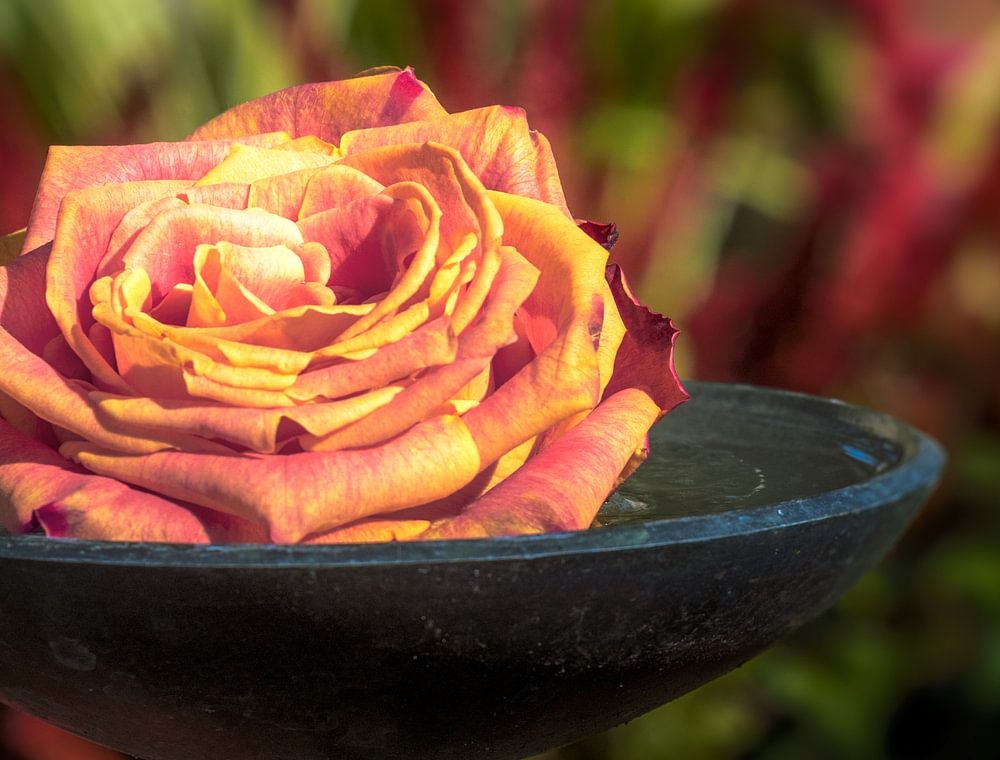 Rozenbloesem in een wijwaterbakje op het kerkhof