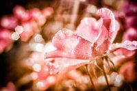 Vrolijke foto van een rozenbloesem in de zon. Door het gebruik van een oude lens op een moderne camera verschijnen de lichtjes op de achtergrond als zeshoeken, wat deze foto een speciaal tintje geeft.