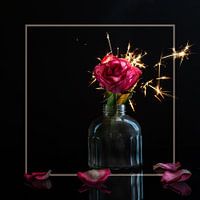 Roos in een vaas op een spiegelend oppervlak en vonken van een fonkelaar omlijst door een discrete lijst