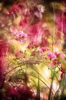 Romantische rozenbloesemtak met veel kleine roze rozenbloesems. Kleurrijke achtergrond in roze, bruin en geel.