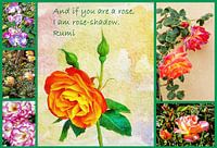 Een collage van rozenafbeeldingen waaronder oranje rozen, lila cascade rozen en een citaat over rozen van de dichter Rumi. Alle individuele beelden zijn door mij gemaakt en samengevoegd in deze collage.