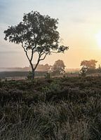 Landschap op het Rozendaalse veld in Velp, op de Veluwe in Gelderland. De lucht kleurt mooi door de zonsopkomst en er hangt nevel over het veld. De heide staat in bloei.