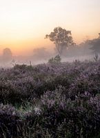 Landschap op het Rozendaalse veld in Rozendaal, Velp, Arnhem. De zon komt bijna op, en de nevel hangt als een deken over de heide, die in bloeit staat.
