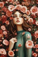 Dit digitale kunstwerk presenteert een portret van een jonge vrouw, omringd door een weelderige overvloed aan roze rozen en bloemen. Haar peinzende blik en subtiel parmantige houding creëren een intrigerende spanning met de zachte, romantische omgeving. De contrasterende turquoise jurk voegt een verrassend element toe aan het overwegend roze palet. Het hyperrealistische detail van het gezicht en de bloemen, gecombineerd met een dromerige, surrealistische sfeer, nodigt de kijker uit tot contemplatie over de grens tussen realiteit en fantasie. Dit werk roept vragen op over vrouwelijkheid, natuurlijke schoonheid en de innerlijke wereld van emoties, terwijl het tegelijkertijd een visueel weelderige esthetische ervaring biedt die de zintuigen prikkelt en de verbeelding stimuleert.