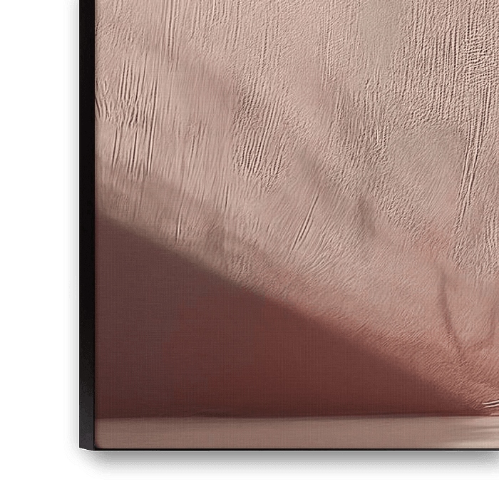Dit minimalistische bloemstilleven vangt een moment van serene schoonheid. Een enkele roze roos in een goudgetinte vaas baadt in warm zonlicht, dat diagonaal over de compositie valt. Het spel van licht en schaduw creëert een fascinerende geometrie, die de eenvoudige elegantie benadrukt. De zachte kleuren en het contrast met het diepe groen van het blad roepen een gevoel van rust en contemplatie op. Deze compositie nodigt de kijker uit om de schoonheid in het alledaagse te ontdekken, waarbij elk element bijdraagt aan een harmonieus geheel dat zowel rustgevend als visueel boeiend is.