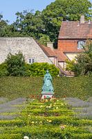 In dit beeld zie je een groene hagen met daar tussen de rozen en lavendel. Centraal in deze foto zie je een standbeeld van koningin Caroline Amalie, welke een mooi groene patina…