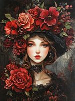 Rozenvrouw - Dit vrouwenportret schilderij toont een jonge vrouw met een diepe blik, omringd door levendige rode rozen en donkere elegante kleding, waar de kleur en textuur de rococo kunststijl combineert met een moderne expressie.