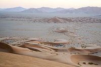 Aan de voet van een hoge zandduin staat een klein tentje met daarnaast een grote 4x4. Twee rode stoeltjes erbij op een blauwe mat. Een spoor van onze voetstappen kruist de lagere zandduintjes: ons pad omhoog. De duinen van de Rub al Khali, het Lege Kwartier, in Oman horen tot de grootste zandduinen ter wereld. Tot onze verbazing zijn er zelfs kleine plukjes woestijngras te vinden. We reden met onze huurauto een weg op die op geen enkele kaart stond. In de duinvallei kozen we een duin om te kamperen. Wildkamperen is een avontuur. Met niemand om ons heen brachten we hier oud en nieuw door. In de ochtend beklimmen we de duin en zien we in het warme ochtendlicht hoe klein ons kampement is in dit enorme woestijnlandschap. Elk moment verandert het licht hier: van blauw naar paars, roze, geel en oranje.