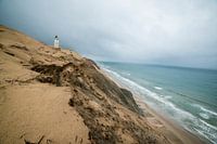 Rubjerg Knude Fyr Lighthouse, vuurtoren aan de noordzee van Denemarken. Vrij onstuimige zee met mooie golven, intense wolken en hoge duinen.