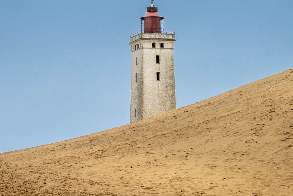 Deze vierkante vuurtoren in de duinen voor de Deense kust (Jutland) werd enkele jaren geleden spectaculair 70 meter landinwaarts opgeschoven omdat die anders in de zee zou verdwenen zijn.