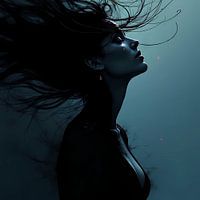 Een intiem en melancholisch portret dat de stilte van een storm vangt. In dit donkere, blauw-getinte profiel zien we een vrouw met wapperende haren, alsof ze midden in de wind staat.