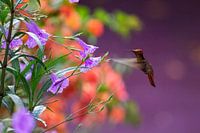 De muskiet kolibrie ( ruby topaz ) of dornasol zoals ze hem in Aruba noemen. Je ziet met de kleine paarse bloemetjes ernaast, hoe klein dit bijzonder vogeltje is