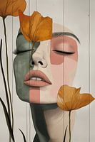 Een digitale illustratie waarin hyperrealisme met gestileerde elementen tot een krachtig portret worden gecombineerd. Een jonge vrouw met gesloten ogen en opgeheven gezicht wordt omringd door gestileerde zonnebloemen tegen een warme, oranje achtergrond. De kunstenaar toont meesterschap in het weergeven van fijne details zoals sproeten…