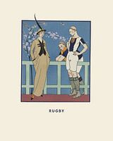 Een historische sport/mode prent in een modern jasje: "Rugby". Geïnspireerd door de art deco, een stijlbeweging die opkwam in de jaren twintig van de vorige eeuw. Nieuw zakelijkheid gemengd met moderne strakke lijnen en kleuren.