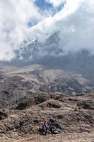 Rugzakken aan de voet van een klim naar de top van de Kilimanjaro in Tanzania. Tijdens een zonnig moment waar wolken aan de top kleven.